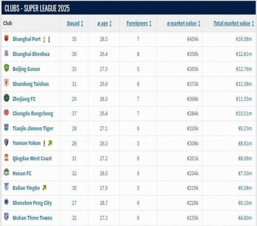 中超球队身价榜:海港居首,申花第二,国安第三,山东第四